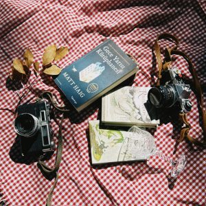 A Charming Picnic Setup With Vintage Cameras, Books, And A Glass Of Wine On A Checkered Cloth.