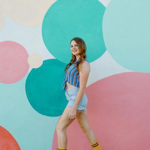 Young Woman In Retro Roller Skates Posing Against A Vibrant Mural.