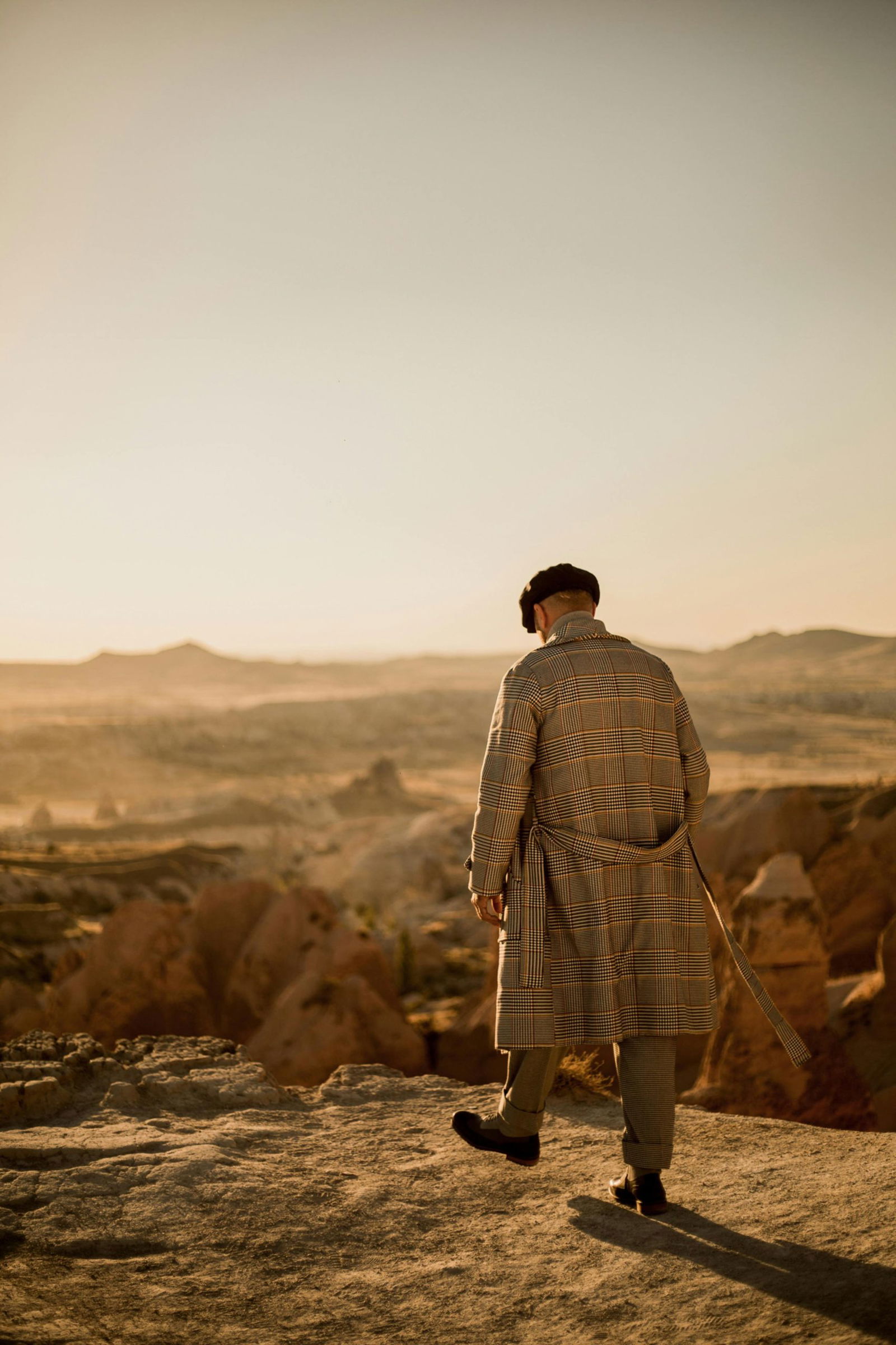 / A Man In Fashionable Attire Overlooking The Scenic Landscape Of Ortahisar, Cappadocia At Sunset.