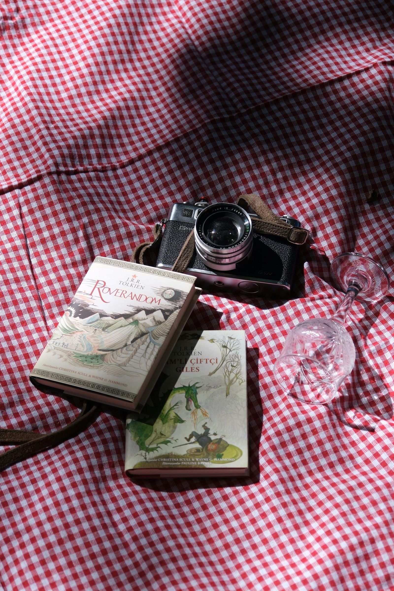 A Vintage Camera And Classic Books Set On A Checkered Picnic Blanket With A Glass In Sunlight.