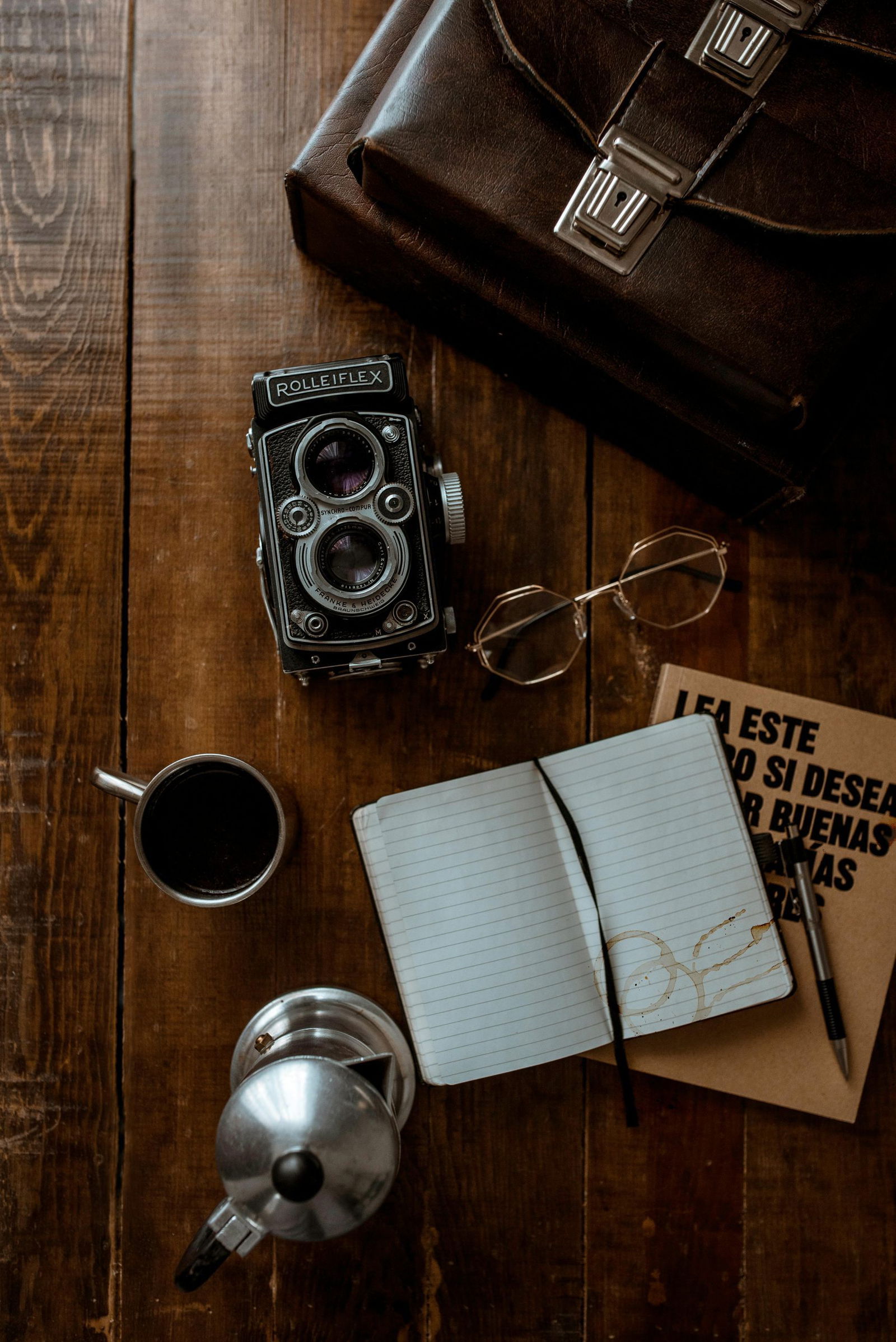 A Vintage Rollei Camera With Coffee, Glasses, And Open Notebook On A Wooden Surface, Ideal For Retro Themes.