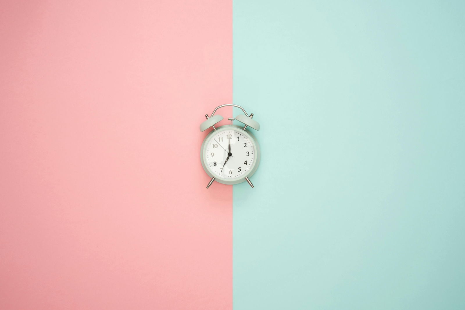 A Vintage Round Clock On A Split Pastel Pink And Blue Background.