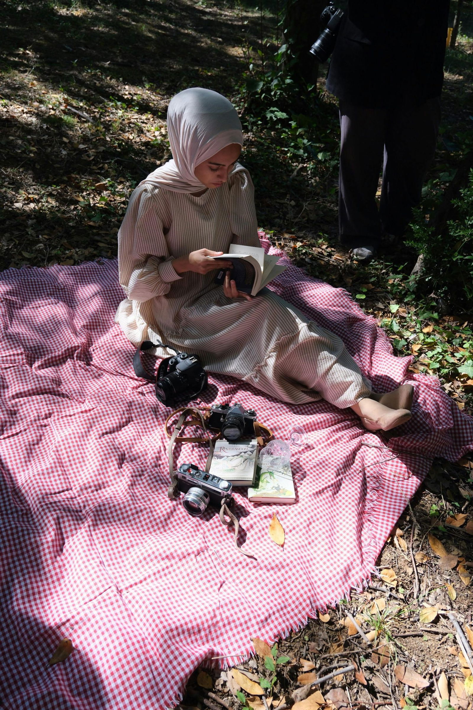 A Young Woman Enjoys A Peaceful Day Outdoors, Reading On A Picnic Blanket Surrounded By Vintage Cameras.