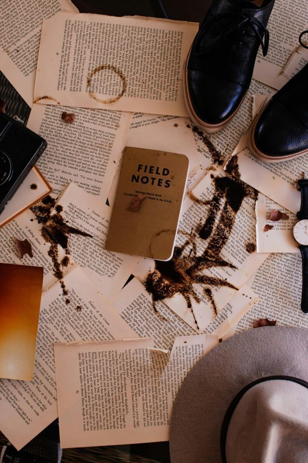 / Artistic Flat Lay Featuring Book Pages, A Camera, Leather Shoes, And A Notebook For An Old World Aesthetic.