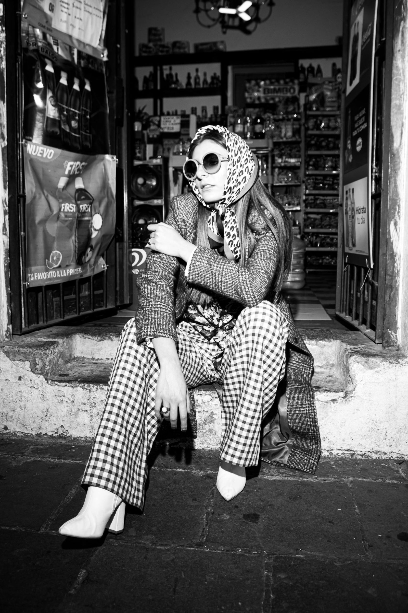Caucasian Woman In Retro Fashion With Sunglasses Sitting At Store Entrance.