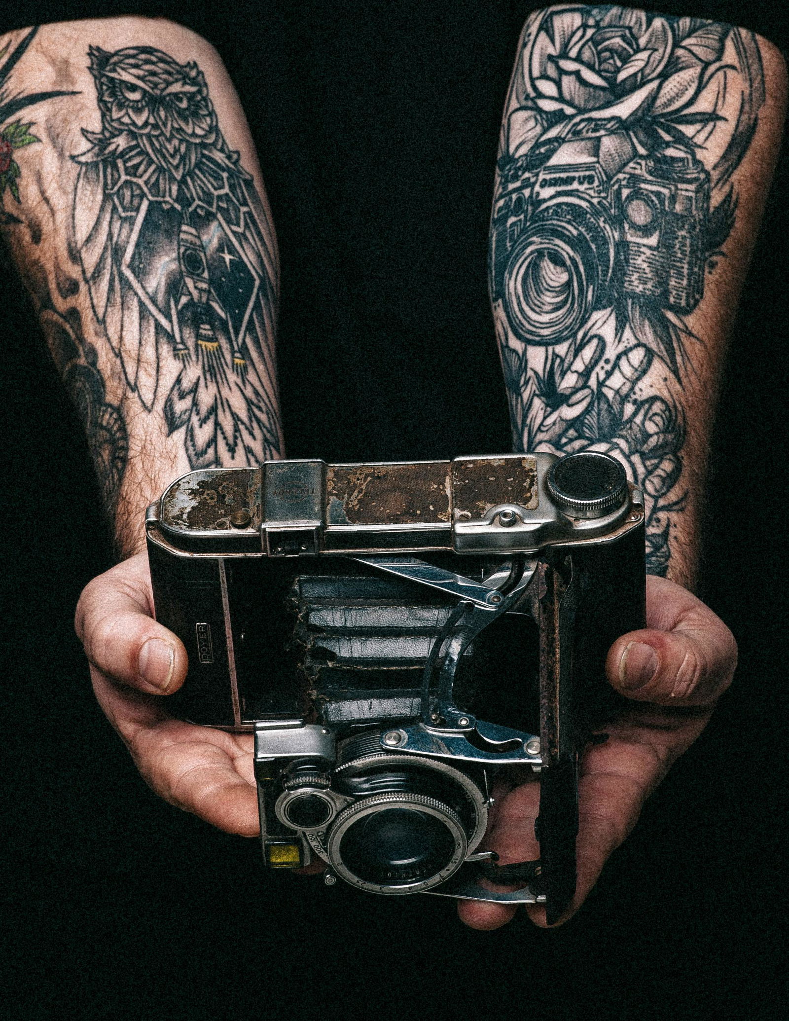 / Close Up Of Hands Holding A Vintage Camera With Tattooed Arms.