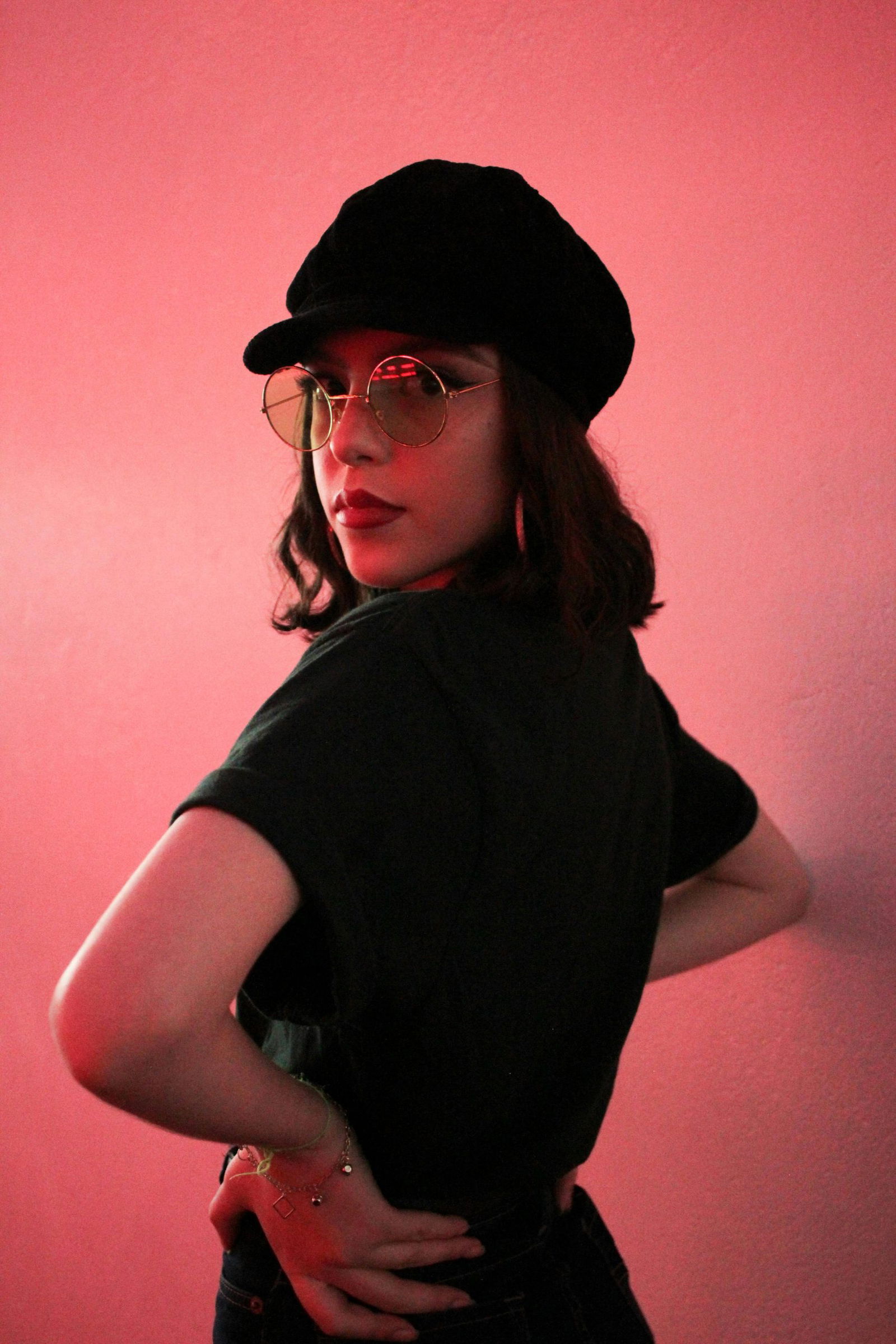 Elegant Woman In Retro Style Sunglasses Posing With A Pink Background.