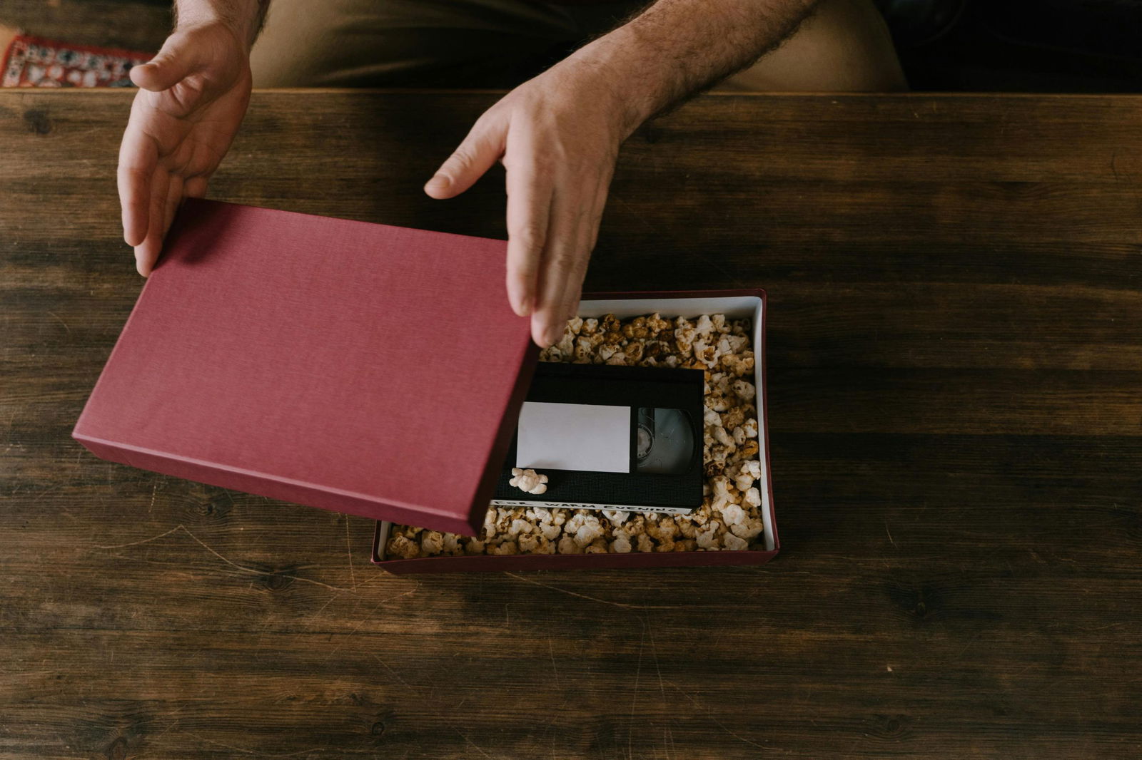 Hands Opening A Maroon Gift Box Containing A VHS Tape Cushioned In Popcorn.