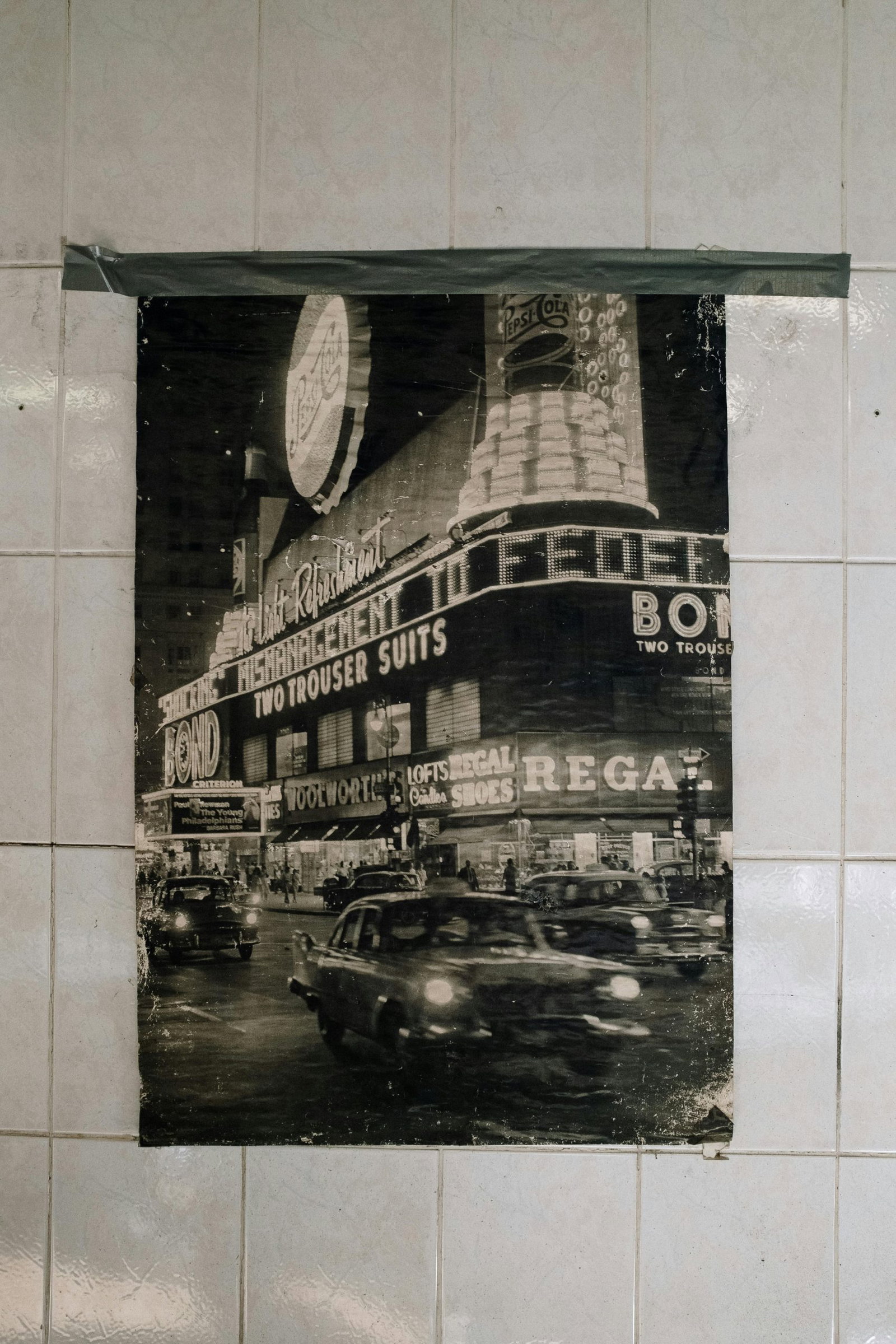 / Retro Car Poster Featuring City Lights On A Tiled Wall For A Classic Decor Touch.