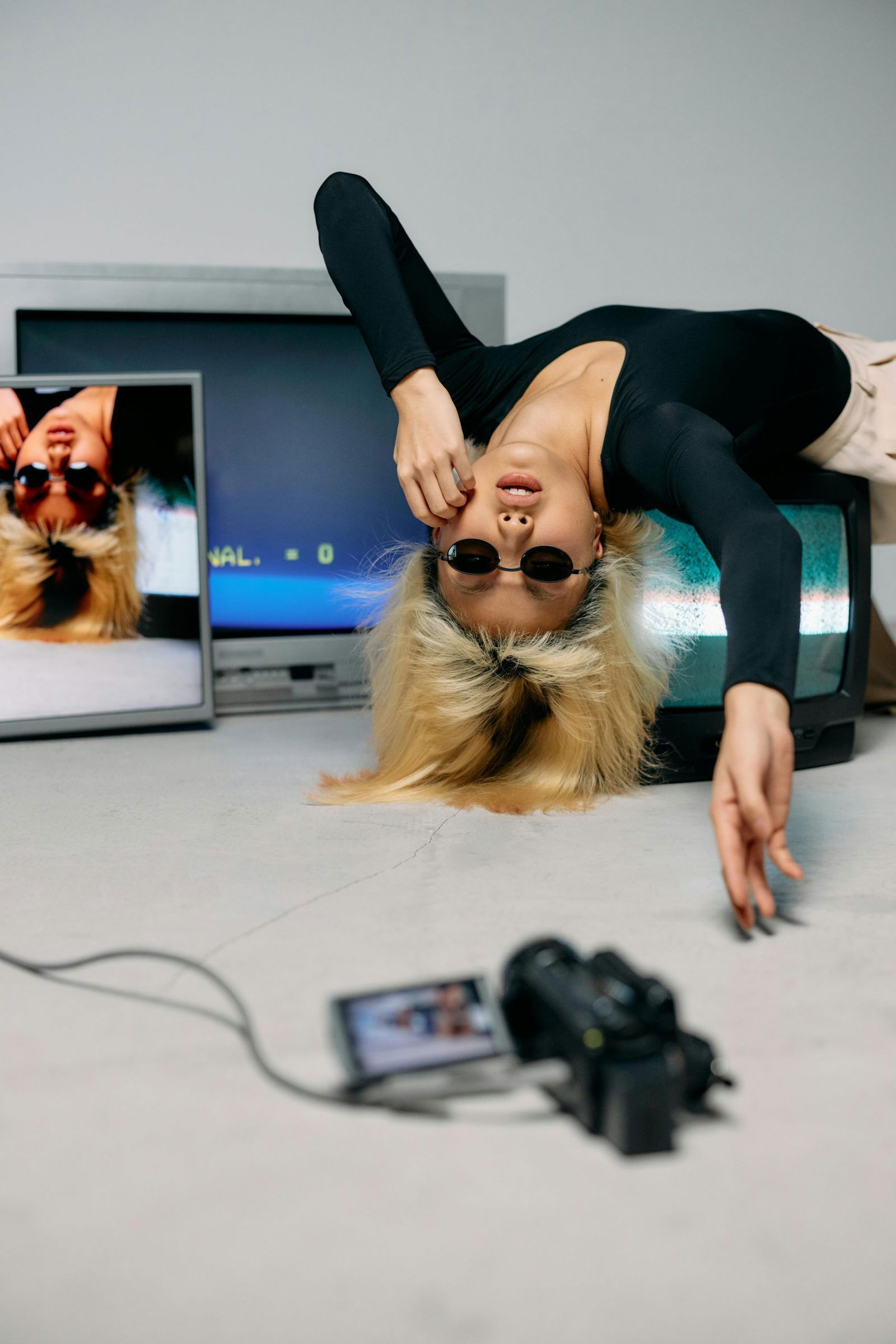 / Stylish Model Posing With Retro TVs And Camera In An Artistic Fashion Shoot.