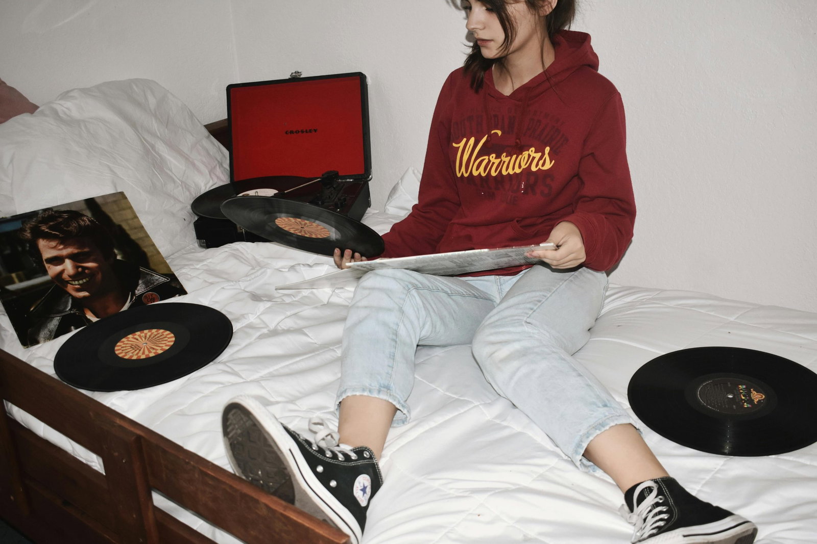 Teen Girl In Hoodie Enjoying Vinyl Records In A Cozy Bedroom. Relaxing And Vintage Vibe.