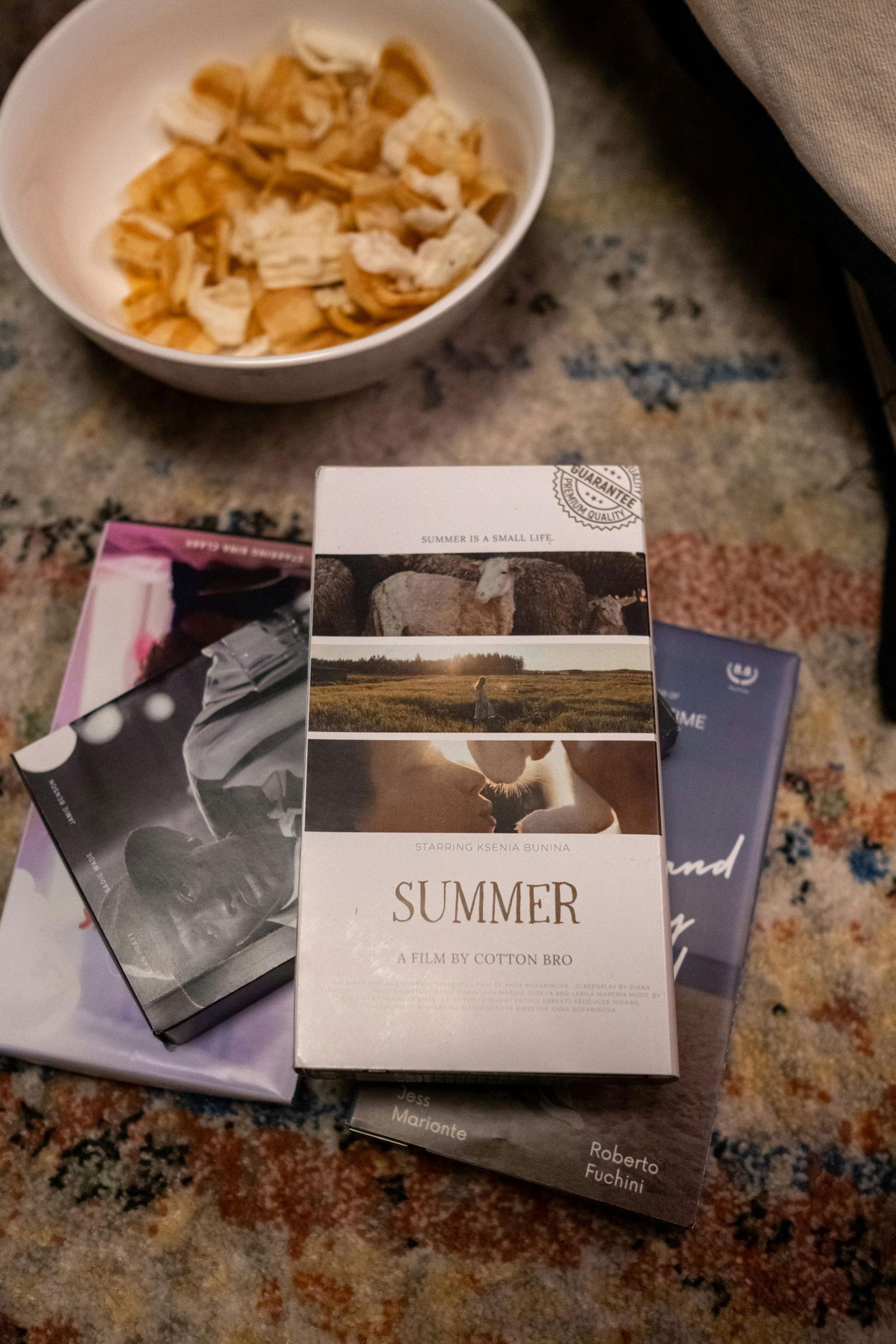 Vintage Movie Night Setup Featuring VHS Tapes And Snacks On A Cozy Carpet.