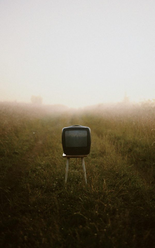 A Lone Vintage TV On A Stool Amidst A Foggy Grass Field, Evoking Nostalgia And Mystery.