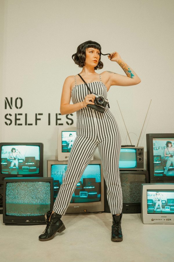 Fashionable Woman In Striped Jumpsuit Posing With Vintage Camera Amid Retro TVs. No Selfies Sign In Background.