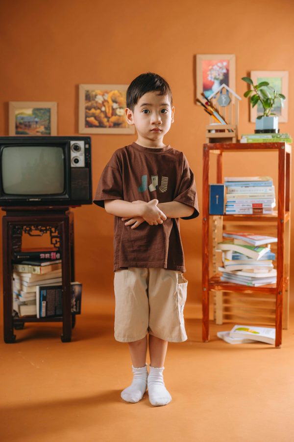 Asian Boy Standing In A Vintage Inspired Room With Orange Decor, TV, Books.