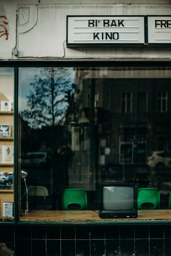 Reflection Of A City Street In A Shop Window Showcasing A Vintage Television.