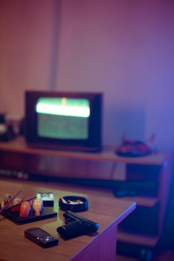 Vintage Living Room With Sushi, Gun, And A Glowing TV, Creating A Nostalgic And Moody Ambiance.