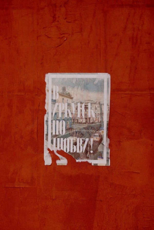 A Damaged Vintage Poster On A Bold Rusty Red Wall Outdoors.