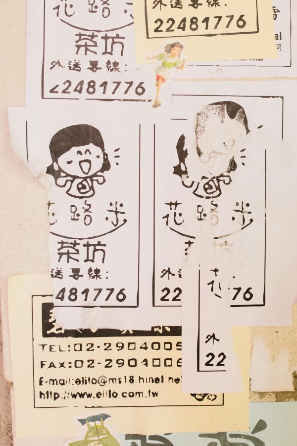A Torn Vintage Advertising Poster Featuring Asian Calligraphy And Illustrations.