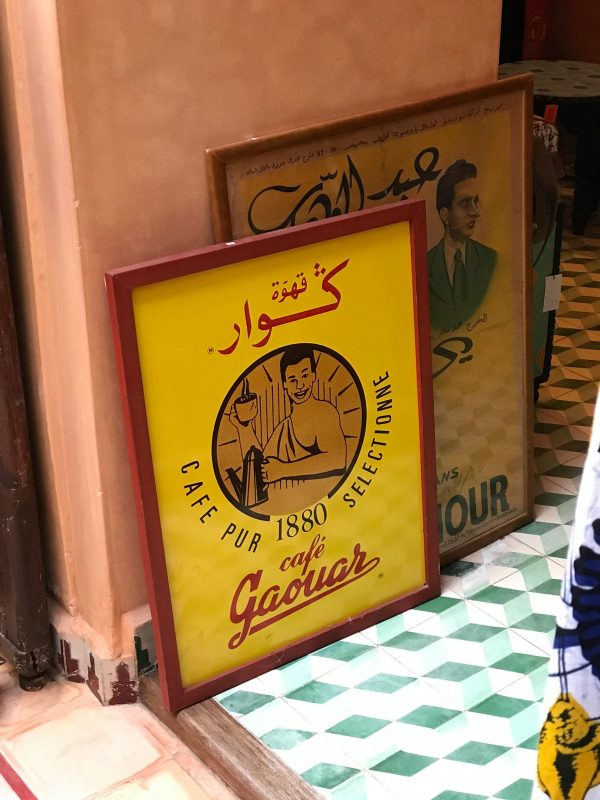 Colorful Vintage Cafe Posters In Marrakesh, Showcasing Arabic Calligraphy And Design.
