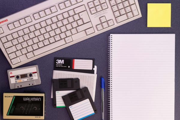 Vintage Office Setup Featuring A Compaq Keyboard, Floppy Disks, Cassette Tape, And Notepad.