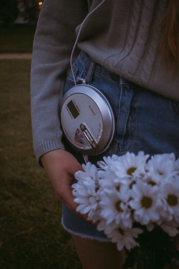 Person Holding Daisies With A Vintage CD Player, Showcasing Retro Style Fashion.
