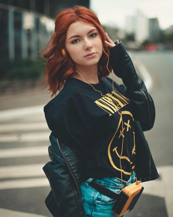 Fashionable Young Woman With Red Hair In Leather Jacket And Headphones On City Street.