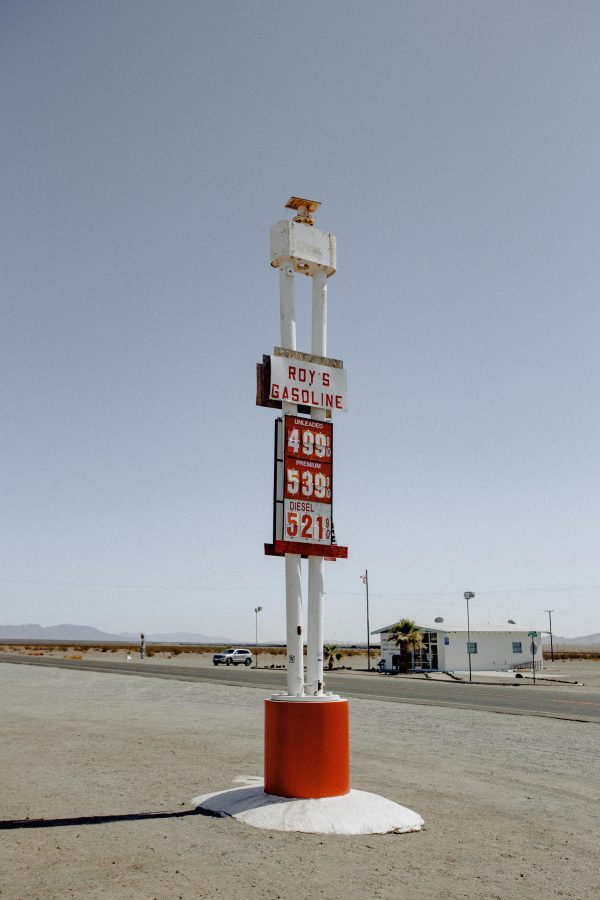 Vintage Gas Station Sign In A Desert Landscape Under A Clear Sky.