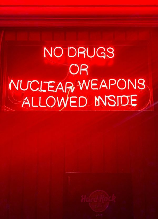 Bright Neon Sign Reading ‘No Drugs Or Nuclear Weapons Allowed Inside’ In A Bar Setting.