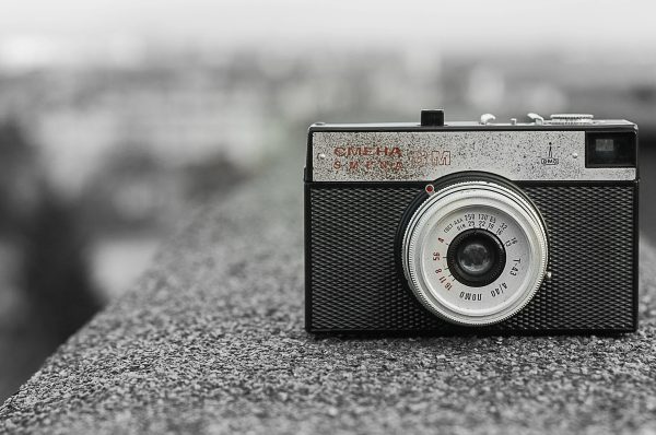 Classic Vintage Camera Resting On A Rough Concrete Surface, Showcasing Soviet Design.