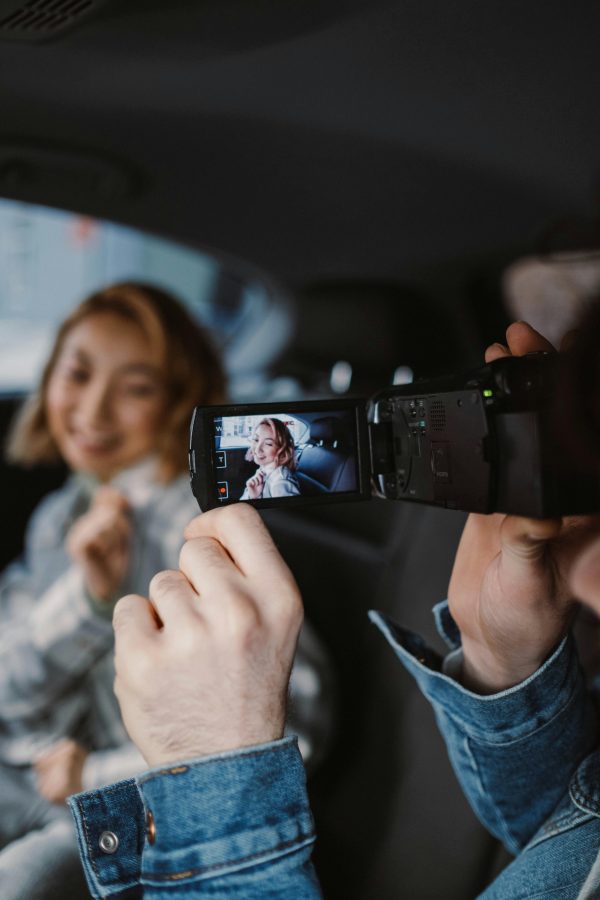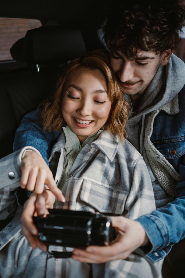 A Couple Enjoys Filming A Candid Moment Together Inside A Car.