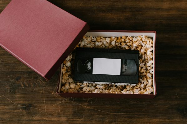 An Open Gift Box With A VHS Tape Nestled In Popcorn, On A Wooden Surface.