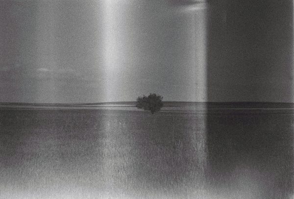 A Solitary Tree Stands In The Middle Of A Vast Field, Captured In Black And White Film.