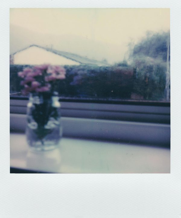 Blurred Polaroid Capturing Flowers In A Glass Vase On A Window Sill With A Scenic View.