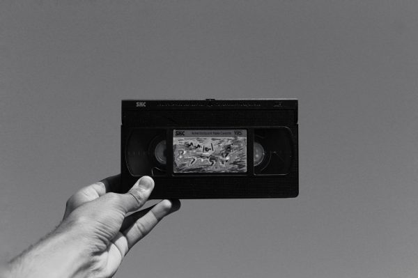 A Hand Holding A Vintage VHS Cassette Tape Against A Plain Gray Background, Evoking Nostalgia.