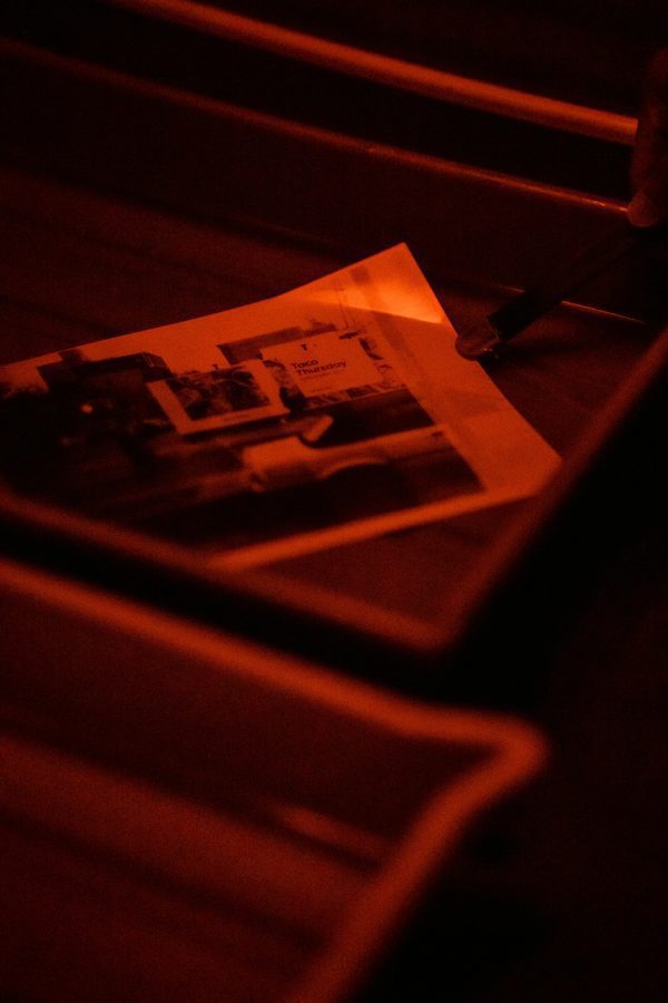 Close Up Of Film Developing Process In A Darkroom Under Red Safelight.