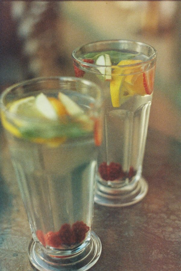 Two Glasses Of Citrus And Berry Infused Water Sit Elegantly On A Bar Counter.