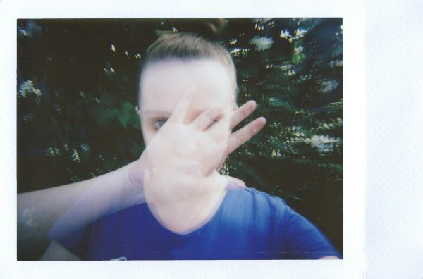A Creative Double Exposure Instant Film Portrait With Hand Gesture Outdoors.