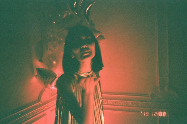 Stylish Woman In Glamorous Setting With Balloons, Captured In Moody Vintage Light.