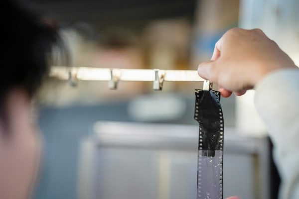Close Up Of A Hand Pinning A Film Strip For Developing In A Darkroom.