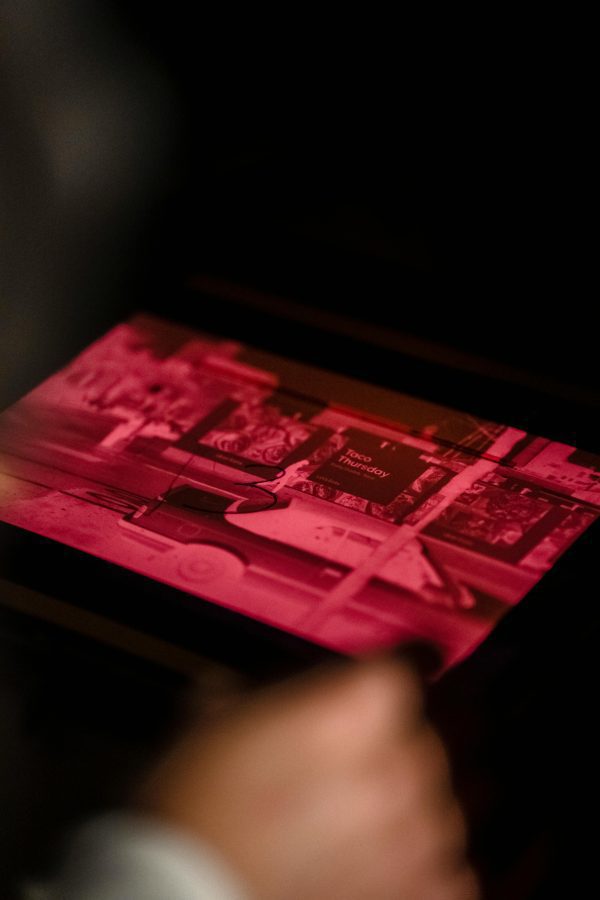 A Person Examining Film Negatives In A Darkroom Under Red Light.