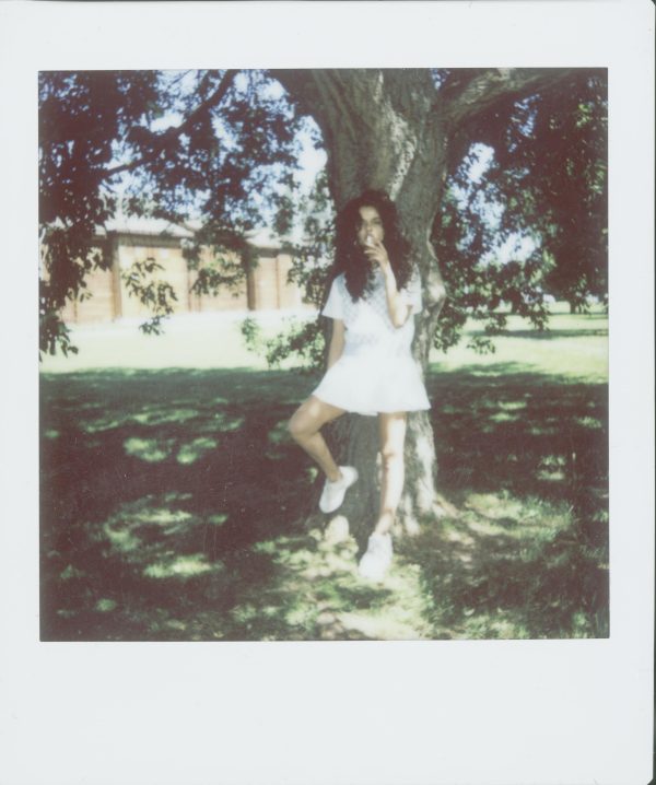 A Vintage Style Photograph Of A Woman In A White Dress Leaning Against A Tree Outdoors.