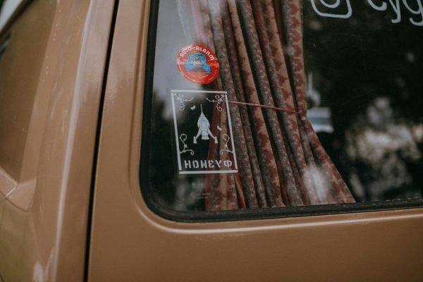 Close Up Of A Vintage Car Window Adorned With Rocket Themed Stickers And Curtains.