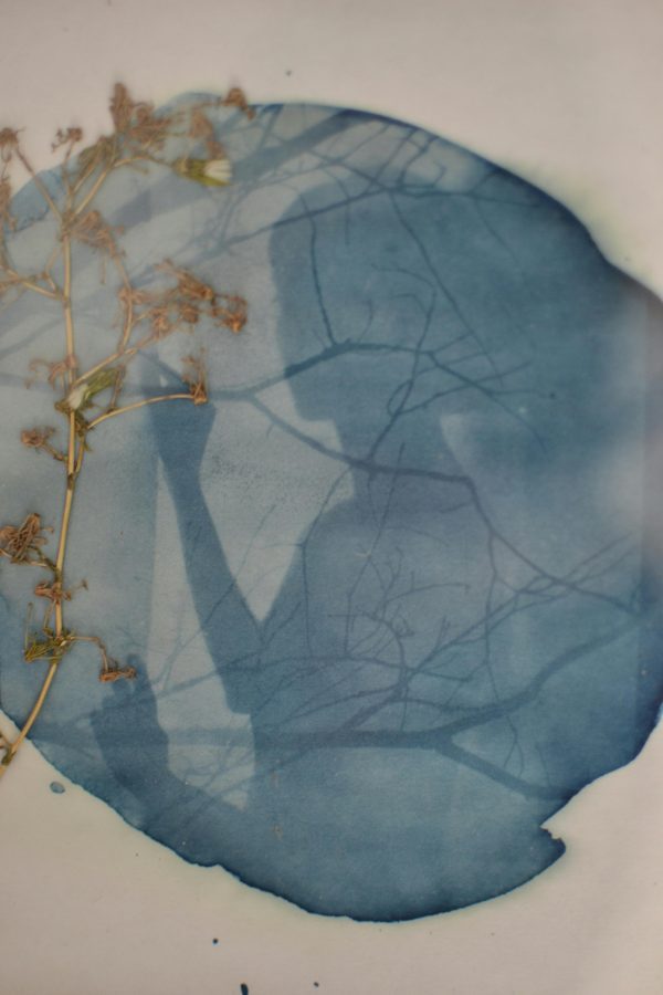 A Delicate Botanical Cyanotype Print On Textured Blue Paper, Showcasing Plant Silhouettes.