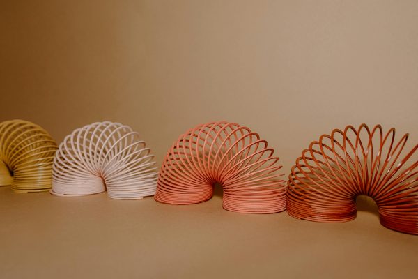A Vibrant Row Of Slinkies Displaying Gradient Rainbow Colors On A Neutral Backdrop.