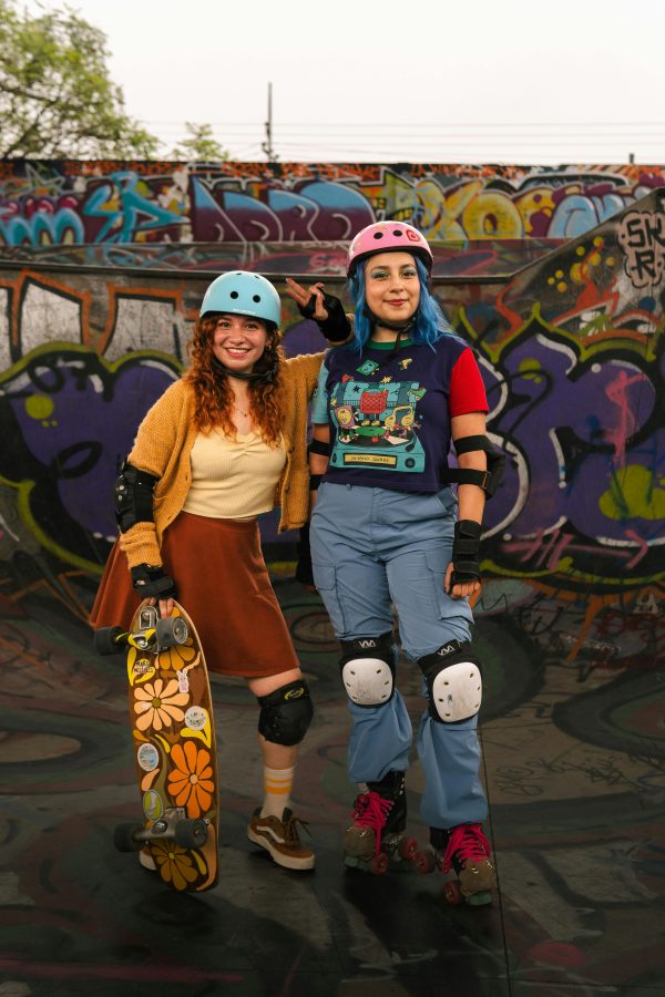 Two Young Women Roller Skating On A Sunny Day, Enjoying Their Leisure Time Together.