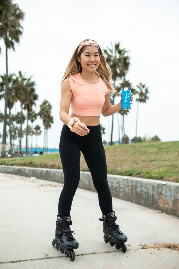 Asian Woman Smiling While Rollerblading In A Park, Enjoying A Fresh Drink.
