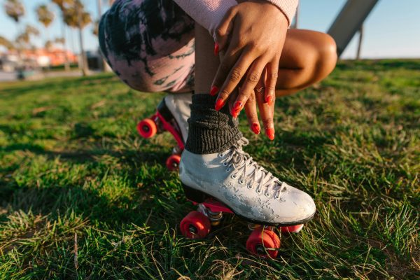 Close Up Of A Woman Enjoying Leisure Time On Roller Skates In A Sunny Park Setting.