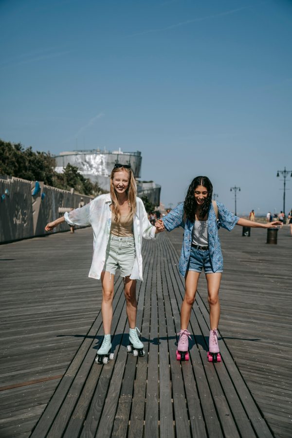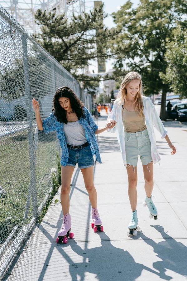 Two Women Roller Skating With Pastel Boots On A Sunny Sidewalk, Enjoying A Fun Outdoor Activity.