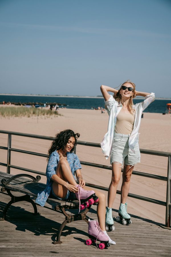 Two Women Enjoying A Sunny Day Roller Skating By The Beach On A Wooden Boardwalk.